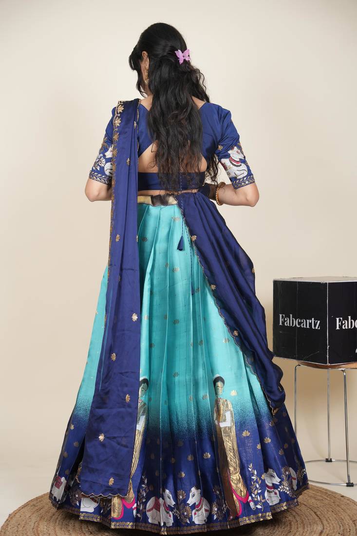 Beautiful south indian style semi-stitched half saree with embroidered blouse and rangoli dupatta for women
