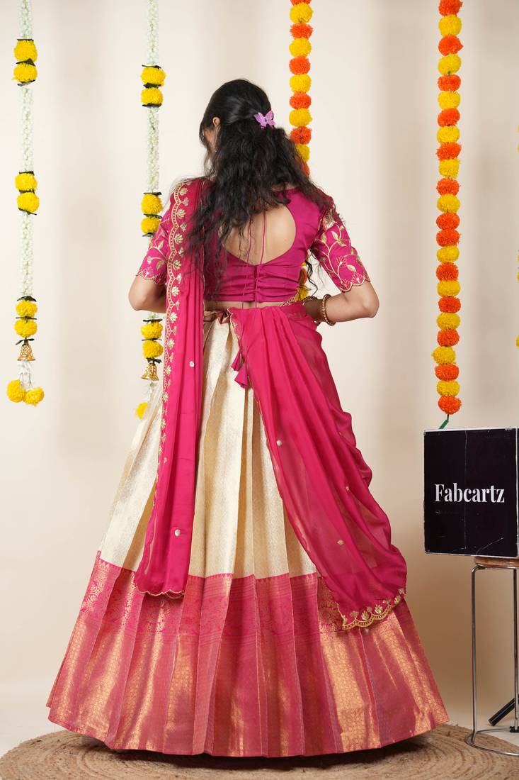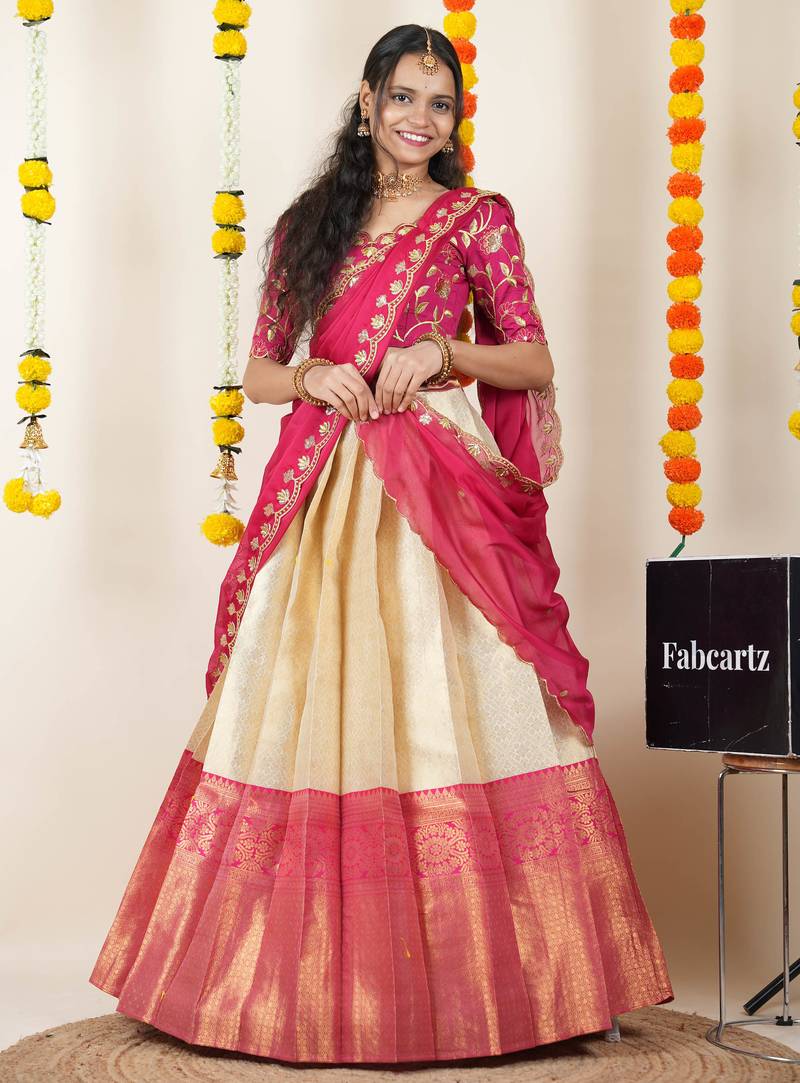 Product Name Beautiful South Indian Style Semi Stitched Half Saree With Embroidered Blouse And Rangoli Dupatta For Women