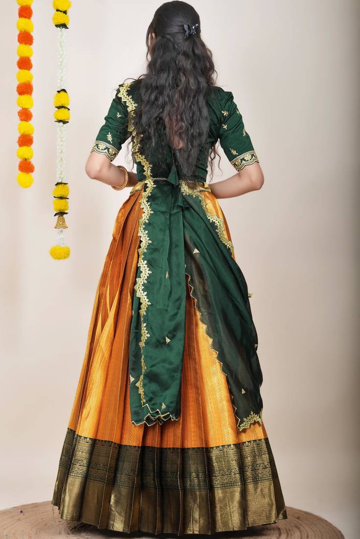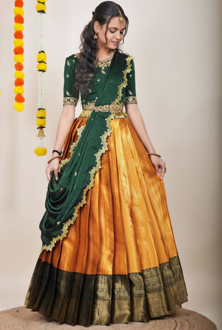 Product Name Beautiful South Indian Style Semi Stitched Half Saree With Embroidered Blouse And Rangoli Dupatta For Women