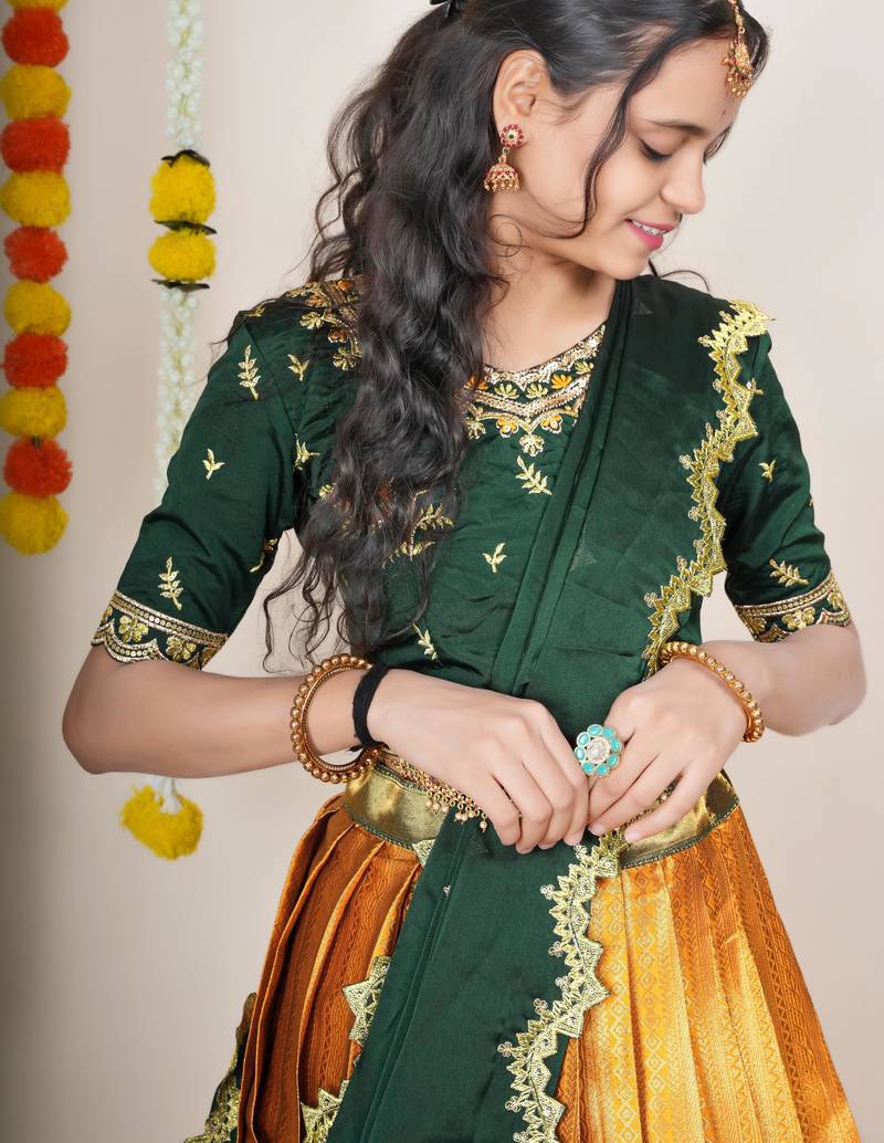Beautiful south indian style semi-stitched half saree with embroidered blouse and rangoli dupatta for women