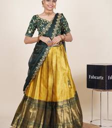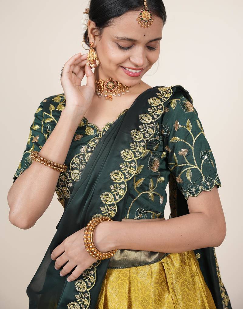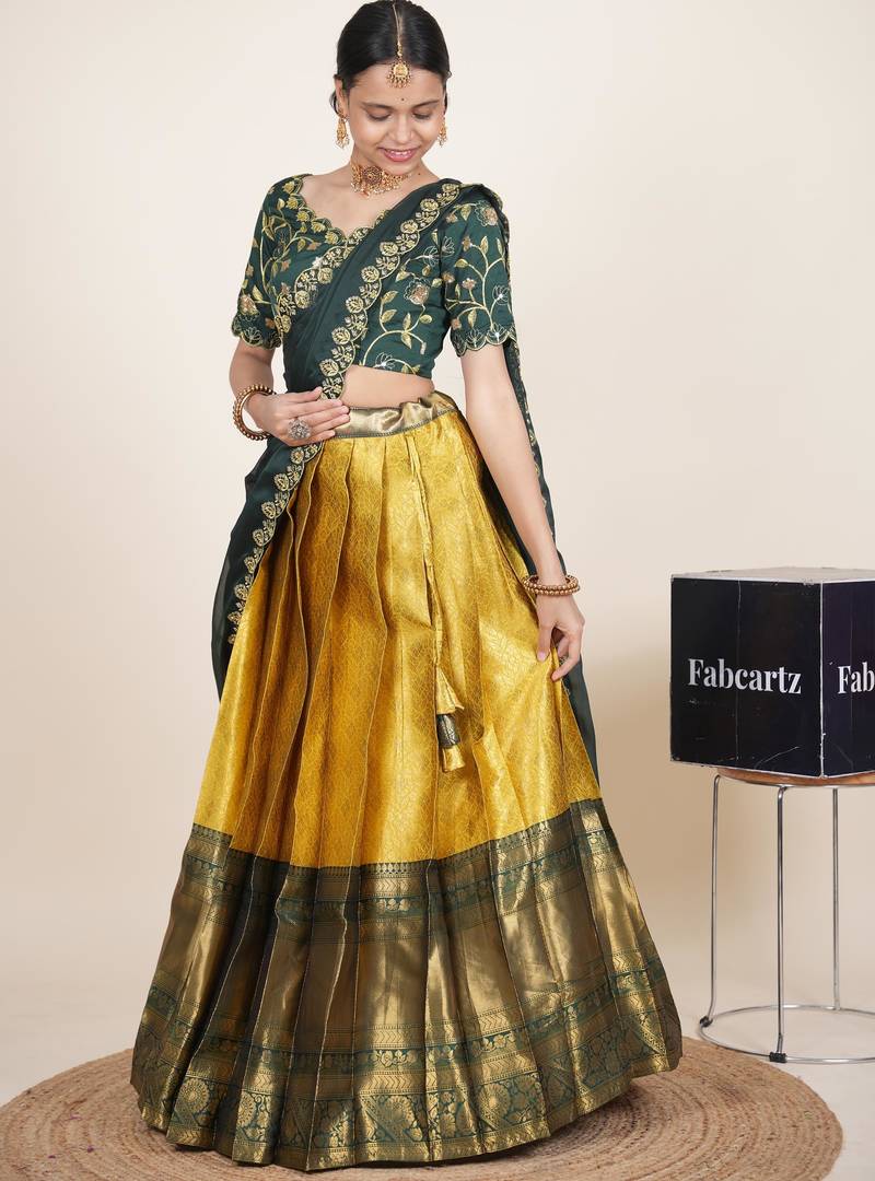 Beautiful south indian style semi-stitched half saree with embroidered blouse and rangoli dupatta for women