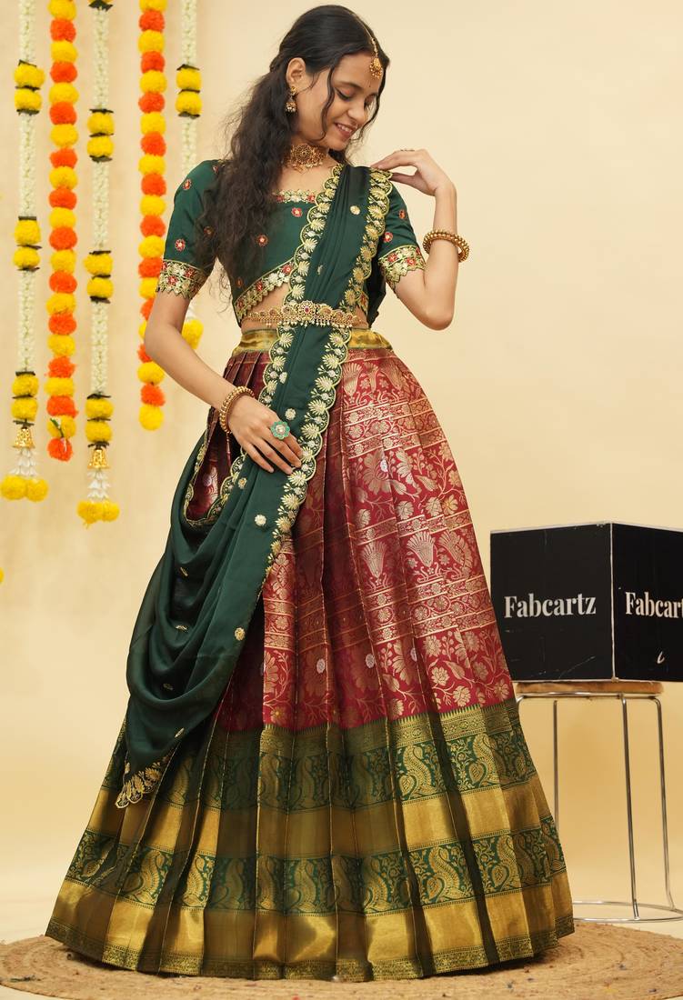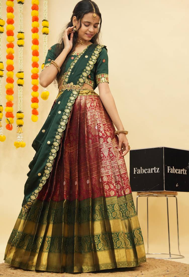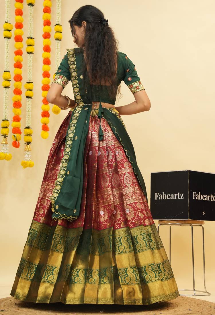 | Product Description | "Fabric: Lehenga Fabric : Lichi Silk Zari Work Choli Fabric: Taffeta Dupatta Fabric: Rangoli Silk Pattern: Lehenga: Solid With Woven Blouse: Embroidery Work Stitch Type Lehenga Is Semi Stitched Choli Is Unstitched Length : Lehenga Length 42 Inch (Semi Stitched) Lehenga Waist Size – Upto 40 Inch Lehenga Flair 3.6 M Blouse 1 M Dupatta 2.40 M Ready To Ship." |
