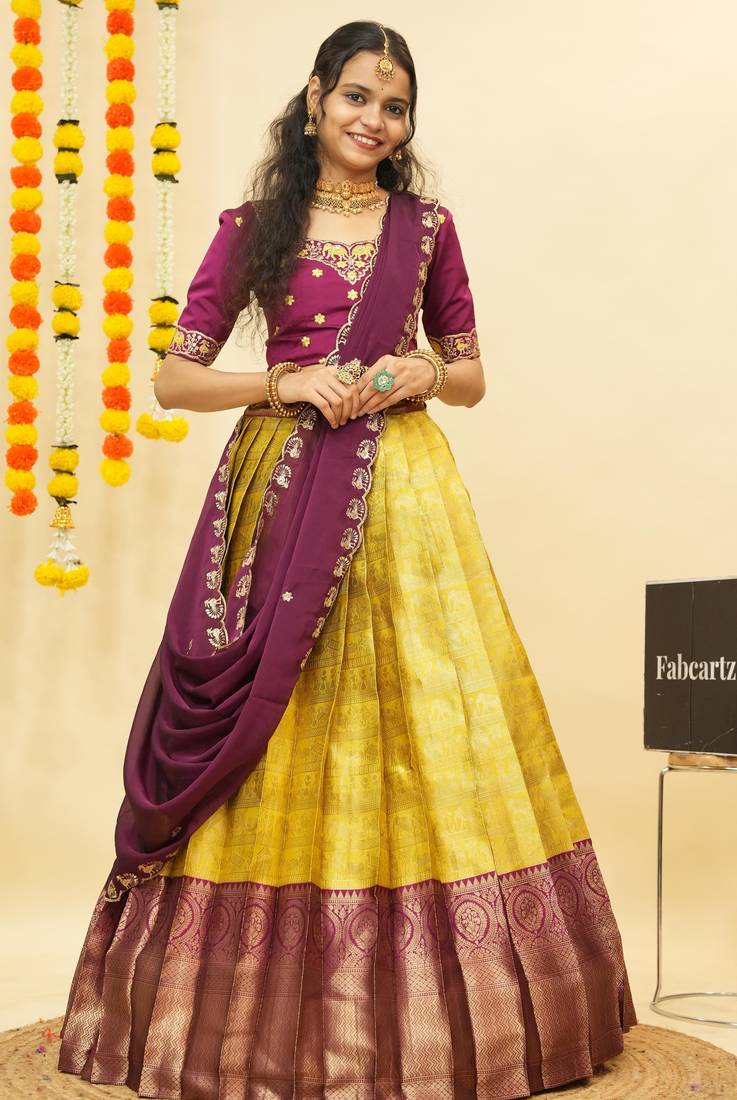 | Product Description | "Fabric: Lehenga Fabric : Lichi Silk Zari Work Choli Fabric: Satin Dupatta Fabric: Rangoli Silk Pattern: Lehenga: Solid With Woven Blouse: Embroidery Work Stitch Type Lehenga Is Semi Stitched Choli Is Unstitched Length : Lehenga Length 42 Inch (Semi Stitched) Lehenga Waist Size – Upto 40 Inch Lehenga Flair 3.6 M Blouse 1 M Dupatta 2.40 M Ready To Ship." |