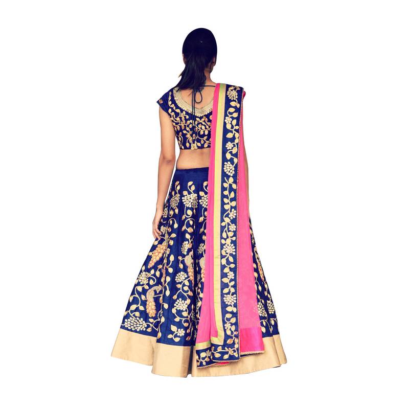 | Product Description | This Set Features A Royal Blue And Gold Zari Embroidered Silk Lehenga With Gota Patti And Pearl Peacock Motifs All Over. It Comes Along With A Matching Blouse And A Light Pink Georgette Dupatta. |