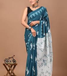 Blue soft mul cotton saree with unstiched attached blouse piece