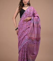 Lavender cotton hand block printed mulmul sarees with attach printed blouse