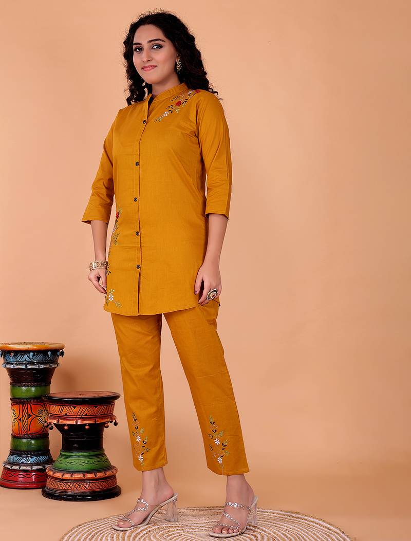 Fashion Petals Yellow Cotton Embroidery Co Ord Set