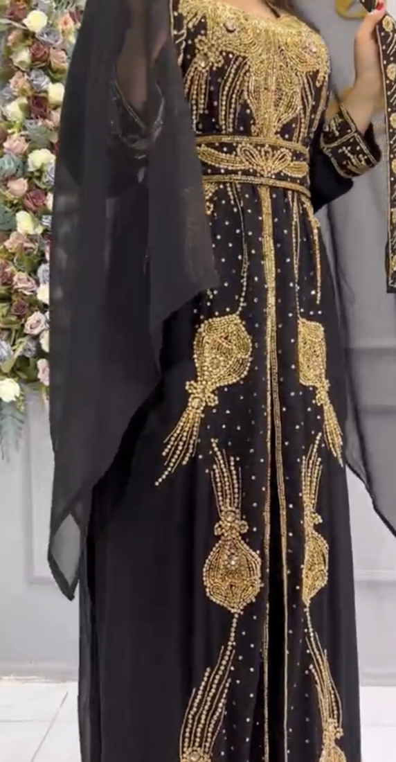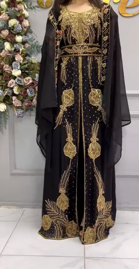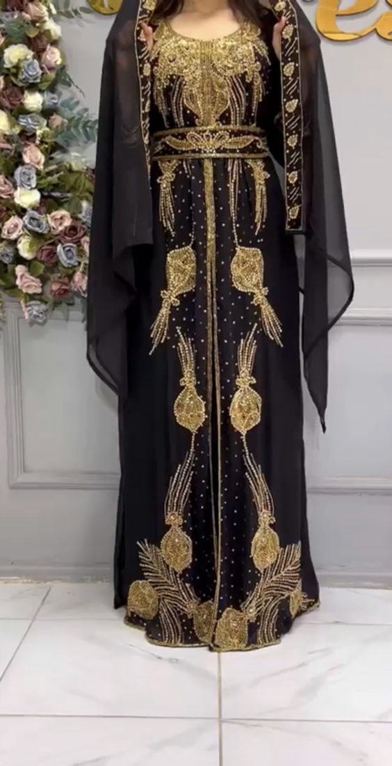 The Kaftan Features A Front Open Style With Intricate Bead And Sequence Embroidery Arranged In Artistic Patterns. The Soft, Flowy Fabric Drapes Beautifully On All Body Shapes, Ensuring Comfort Throughout The Day. It Also Comes With A Fully Embroidered Belt, Allowing You To Adjust The Fit According To Your Preference. The Matching Black Dupatta/Scarf With Golden Embroidery Completes The Outfit Perfectly, Giving You A Complete Traditional And Festive Look. Whether It’s A Wedding, Engagement, Eid Celebration, Festival, Or Party, This Kaftan Will Make You Stand Out With Elegance And Confidence. |