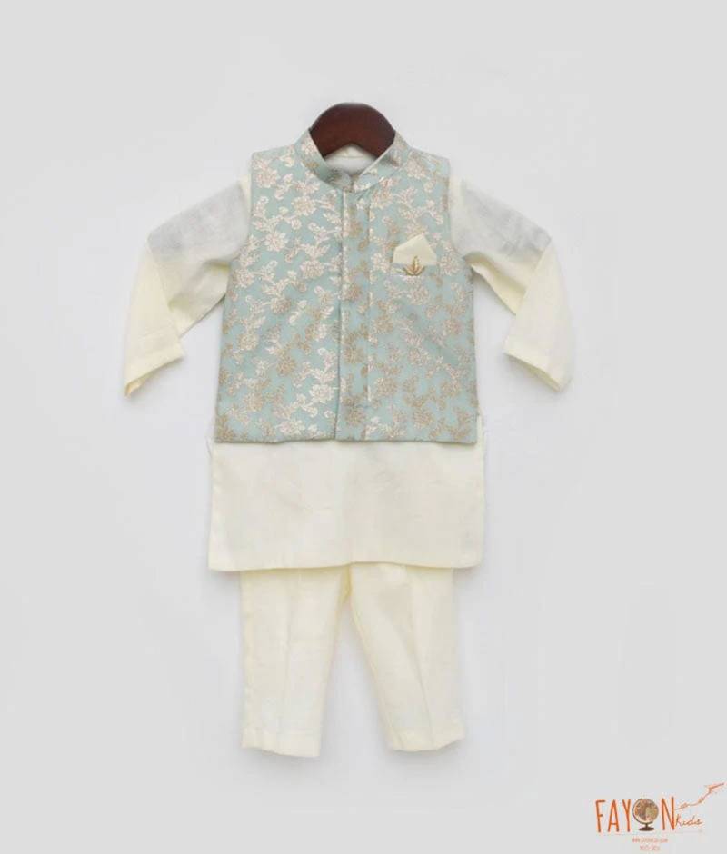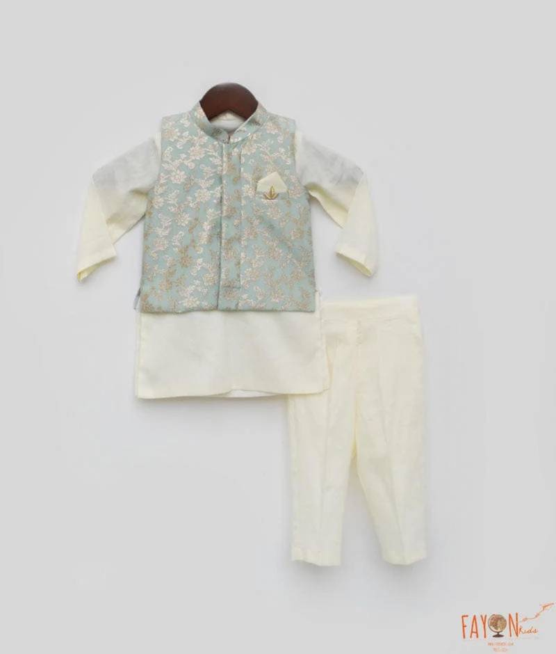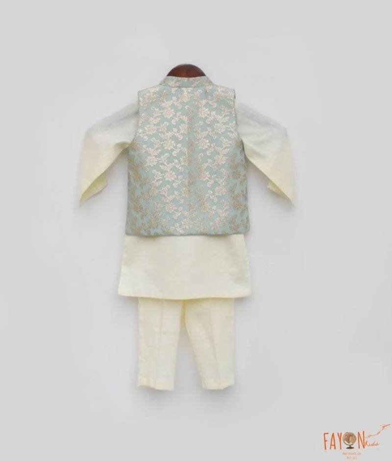Product Description | Mint Green Chanderi Brocade Jacket And Kurta Pant For Boys. Get This Beautiful Jacket Which Has A Motif On Pocket And Is The Right Fit For The Season.
