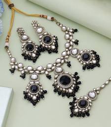 | Product Description | Adjustable Rope | Necklace Length: 22.00 Cm X Width: 7.50 Cm | Earring Length: 8.00 Cm X Width: 3.40 Cm | Maang Tikka Length: 19.00 Cm X Width: 3.40 Cm | Metal: Alloy With Good Quality Mehndi Gold Plated | Color: Black | Stone: Kundan & Beads | Gross Weight: 170.00 Grams | Package Content: 1 Piece Of Necklace/1 Pair Of Earrings/1 Piece Of Maang Tikka | Back Finding: Post With Friction Back X Earring Style: Dangle |