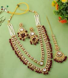 Product Description | Adjustable Rope | Necklace Length: 54.00 Cm X Width: 4.00 Cm | Earring Length: 9.00 Cm X Width: 3.50 Cm | Maang Tikka Length: 22.00 Cm X Width: 4.00 Cm | Metal: Alloy With Good Quality Gold Plated | Color: Maroon | Stone: Kundan & Imitation Pearl | Package Content: 1 Piece Of Necklace/1 Pair Of Earring/1 Piece Of Maang Tikka | Gross Weight: 238.00 Grams | Back Finding: Post With Friction Back X Earring Style: Jhumka | Care Instruction : Avoid Heat & Chemicals Like Perfume, Deo, Alcohol, Etc. |