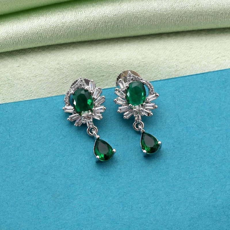 | Product Description | Earring Length: 2.50 Cm X Width: 1.00 Cm | Metal: Brass With Good Quality Silver Plated | Color: Green | Stone: American Diamond | Gross Weight: 8.00 Grams | Package Content: 1 Pair Of Earrings | Back Finding: Post With Friction Back X Earring Style: Drop |