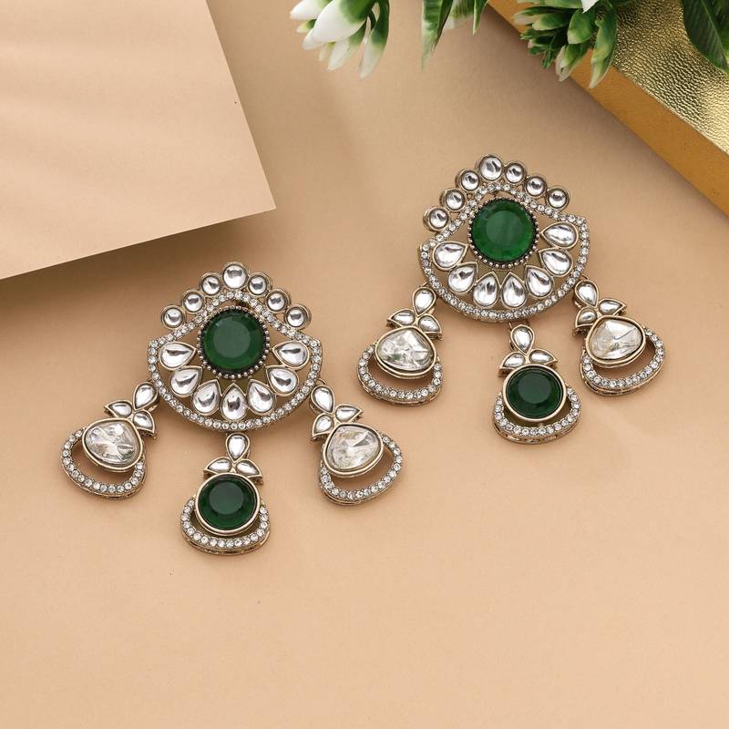 | Product Description | Earring Length: 6.50 Cm X Width: 3.20 Cm | Metal: Alloy With Good Quality Mehndi Gold Plated | Color: Green | Stone: Kundan | Gross Weight: 40.00 Grams | Package Content: 1 Pair Of Earrings | Back Finding: Post With Friction Back X Earring Style: Dangle |