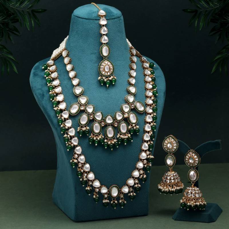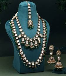 Product Description | Adjustable Rope | Necklace Length: 60.00 Cm X Width: 6.00 Cm | Earring Length: 9.00 Cm X Width: 3.00 Cm | Metal: Alloy With Good Quality Gold Plated | Color: Green | Stone: Kundan & Imitation Pearl | Gross Weight: 270.00 Grams | Package Content: 1 Piece Of Necklace/1 Pair Of Earring/1 Piece Of Maang Tikka | Back Finding: Post With Friction Back X Earring Style: Jhumka |