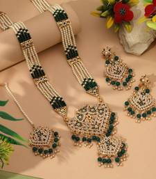 Product Description | Adjustable Rope | Necklace Length: 46.00 Cm X Width: 1.60 Cm | Pendant Length: 10.00 Cm X Width: 6.50 Cm | Earring Length: 7.80 Cm X Width: 3.50 Cm | Maang Tikka Length: 13.50 Cm X Width: 3.50 Cm | Metal: Alloy With Good Quality Gold Plated | Color: Green | Stone: Glass Stone & Beads | Gross Weight: 76.00 Grams | Package Content: 1 Piece Of Necklace/1 Pair Of Earring/1 Piece Of Maang Tikka | Back Finding: Post With Friction Back X Earring Style: Dangle |