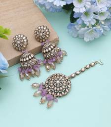 | Product Description | Earring Length: 6.50 Cm X Width: 3.00 Cm | Maang Tikka Length: 12.00 Cm X Width: 3.60 Cm | Metal: Alloy With Good Quality Mehndi Gold Plated | Color: Light Purple | Stone: Kundan | Gross Weight: 66.00 Grams | Package Content: 1 Pair Of Earrings/1 Piece Of Maang Tikka | Back Finding: Post With Friction Back X Earring Style: Jhumka |