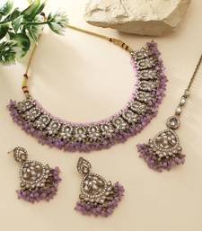 Product Description | Adjustable Rope | Necklace Length: 16.00 Cm X Width: 3.00 Cm | Earring Length: 6.30 Cm X Width: 3.20 Cm | Maang Tikka Length: 18.00 Cm X Width: 3.20 Cm | Metal: Alloy With Good Quality Mehandi Gold Plated | Color: Light Purple | Stone: Kundan & Beads | Gross Weight: 90.00 Grams | Package Content: 1 Piece Of Necklace/1 Pair Of Earrings/1 Piece Of Maang Tikka | Back Finding: Post With Friction Back Earring Style: Dangle |