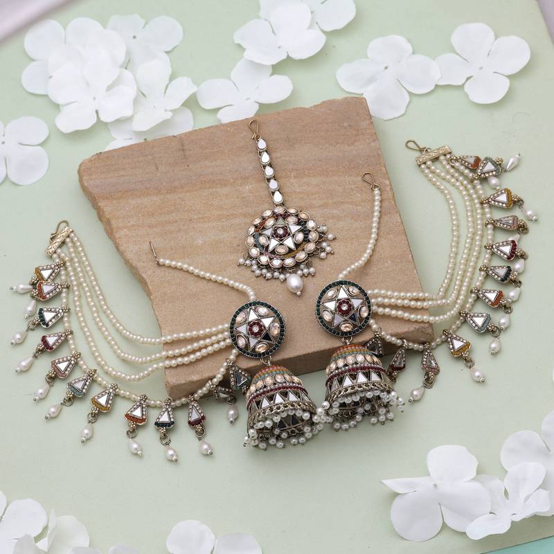 | Product Description | Chain Length: 15.00 Cm | Earring Length: 7.20 Cm X Width: 4.00 Cm | Maang Tikka Length: 11.00 Cm X Width: 3.60 Cm | Metal: Alloy With Good Quality Mehndi Gold Plated | Color: Multi | Stone: Kundan & Mirror & Beads | Gross Weight: 123.00 Grams | Package Content: 1 Pair Of Earrings/1 Piece Of Maang Tikka | Back Finding: Post With Friction Back X Earring Style: Jhumka |