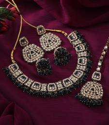 Product Description | Adjustable Rope | Necklace Length: 20.00 Cm X Width: 2.30 Cm | Earring Length: 8.50 Cm X Width: 3.50 Cm | Maang Tikka Length: 18.50 Cm X Width: 3.50 Cm | Metal: Alloy With Good Quality Mehandi Gold Plated | Color: Navy Blue | Stone: Kundan & Beads | Gross Weight: 100.00 Grams | Package Content: 1 Piece Of Necklace/1 Pair Of Earrings/1 Piece Of Maang Tikka | Back Finding: Post With Friction Back Earring Style: Jhumka |