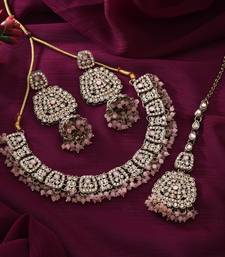 Product Description | Adjustable Rope | Necklace Length: 20.00 Cm X Width: 2.30 Cm | Earring Length: 8.50 Cm X Width: 3.50 Cm | Maang Tikka Length: 18.50 Cm X Width: 3.50 Cm | Metal: Alloy With Good Quality Mehandi Gold Plated | Color: Pink | Stone: Kundan & Beads | Gross Weight: 100.00 Grams | Package Content: 1 Piece Of Necklace/1 Pair Of Earrings/1 Piece Of Maang Tikka | Back Finding: Post With Friction Back Earring Style: Jhumka |