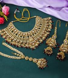 Product Description | Adjustable Rope | Necklace Length: 20.00 Cm X Width: 10.50 Cm | Chain Length: 14.00 Cm |Earring Length: 11.00 Cm X Width: 4.50 Cm | Maath Patti Length: 18.00 Cm X Width: 26.00 Cm | Metal: Alloy With Good Quality Gold Plated | Color: Maroon | Stone: Kundan & Imitation Pearl | Package Content: 1 Piece Of Necklace/1 Pair Of Earring/1 Piece Of Matha Patti | Gross Weight: 370.00 Grams | Back Finding: Post With Friction Back X Earring Style: Jhumka | Care Instruction : Avoid Heat & Chemicals Like Perfume, Deo, Alcohol, Etc. |