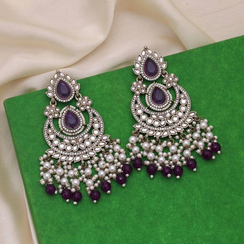 | Product Description | Earring Length: 10.50 Cm X Width: 4.60 Cm | Metal: Alloy With Good Quality Mehendi Gold Plated | Color: Purple | Stone: Kundan & Imitation Pearl | Gross Weight: 65.00 Grams | Package Content: 1 Pair Of Earrings | Back Finding: Post With Friction Back X Earring Style: Dangle |