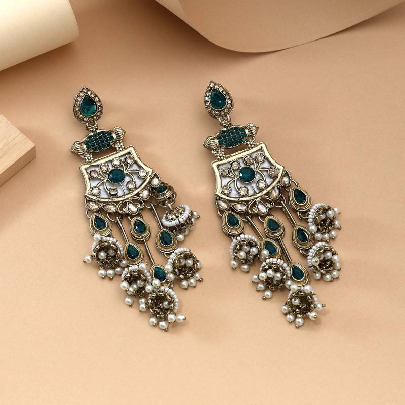 | Product Description | Earring Length: 11.00 Cm X Width: 3.30 Cm | Metal: Alloy With Good Quality Mehndi Gold Plated | Color: Rama Green | Stone: Kundan & Beads | Gross Weight: 64.00 Grams | Package Content: 1 Pair Of Earring | Back Finding: Post With Friction Back X Earring Style: Dangle |