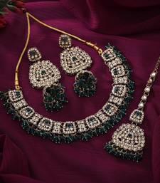 Product Description | Adjustable Rope | Necklace Length: 20.00 Cm X Width: 2.30 Cm | Earring Length: 8.50 Cm X Width: 3.50 Cm | Maang Tikka Length: 18.50 Cm X Width: 3.50 Cm | Metal: Alloy With Good Quality Mehandi Gold Plated | Color: Rama Green | Stone: Kundan & Beads | Gross Weight: 100.00 Grams | Package Content: 1 Piece Of Necklace/1 Pair Of Earrings/1 Piece Of Maang Tikka | Back Finding: Post With Friction Back Earring Style: Jhumka |