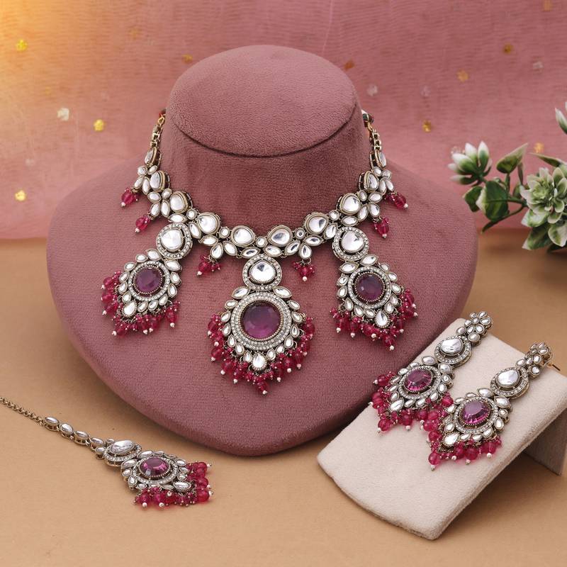 Rani color kundan necklace set