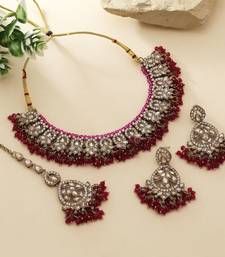 Product Description | Adjustable Rope | Necklace Length: 16.00 Cm X Width: 3.00 Cm | Earring Length: 6.30 Cm X Width: 3.20 Cm | Maang Tikka Length: 18.00 Cm X Width: 3.20 Cm | Metal: Alloy With Good Quality Mehandi Gold Plated | Color: Rani | Stone: Kundan & Beads | Gross Weight: 90.00 Grams | Package Content: 1 Piece Of Necklace/1 Pair Of Earrings/1 Piece Of Maang Tikka | Back Finding: Post With Friction Back Earring Style: Dangle |