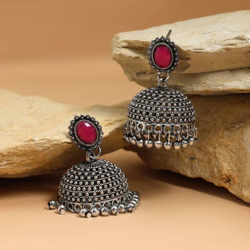 Product Description | Earring Length: 4.00 Cm X Width: 2.50 Cm | Metal: Alloy With Good Quality Silver Plated | Color: Rani | Stone: Glass Stone | Gross Weight: 17.00 Grams | Package Content: 1 Pair Of Earring | Back Finding: Post With Friction Back X Earring Style: Jhumka |