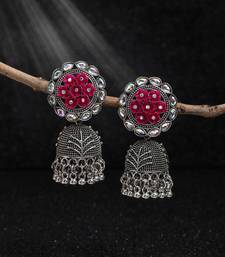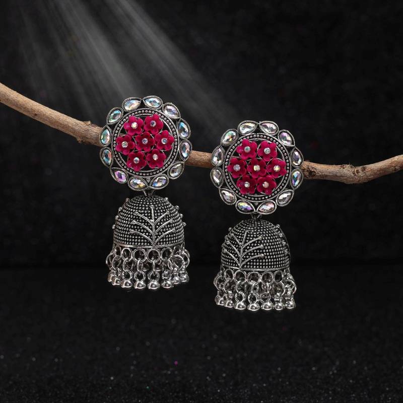 Product Description | Earring Length: 5.30 Cm X Width: 2.00 Cm | Metal: Alloy With Good Quality Silver Plated | Color: Rani | Stone: Glass Stone | Gross Weight: 21.00 Grams | Package Content: 1 Pair Of Earring | Back Finding: Post With Friction Back X Earring Style: Jhumka |