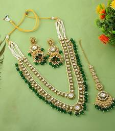 Product Description | Adjustable Rope | Necklace Length: 54.00 Cm X Width: 4.00 Cm | Earring Length: 9.00 Cm X Width: 3.50 Cm | Maang Tikka Length: 22.00 Cm X Width: 4.00 Cm | Metal: Alloy With Good Quality Gold Plated | Color: Green | Stone: Kundan & Imitation Pearl | Package Content: 1 Piece Of Necklace/1 Pair Of Earring/1 Piece Of Maang Tikka | Gross Weight: 238.00 Grams | Back Finding: Post With Friction Back X Earring Style: Jhumka | Care Instruction : Avoid Heat & Chemicals Like Perfume, Deo, Alcohol, Etc. |