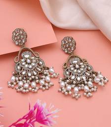 Product Description | Earring Length: 8.00 Cm X Width: 3.50 Cm | Metal: Alloy With Good Quality Mehndi Gold Plated | Color: White | Stone: Kundan & Imitation Pearl | Gross Weight: 38.00 Grams | Package Content: 1 Pair Of Earring | Back Finding: Post With Friction Back X Earring Style: Dangle |