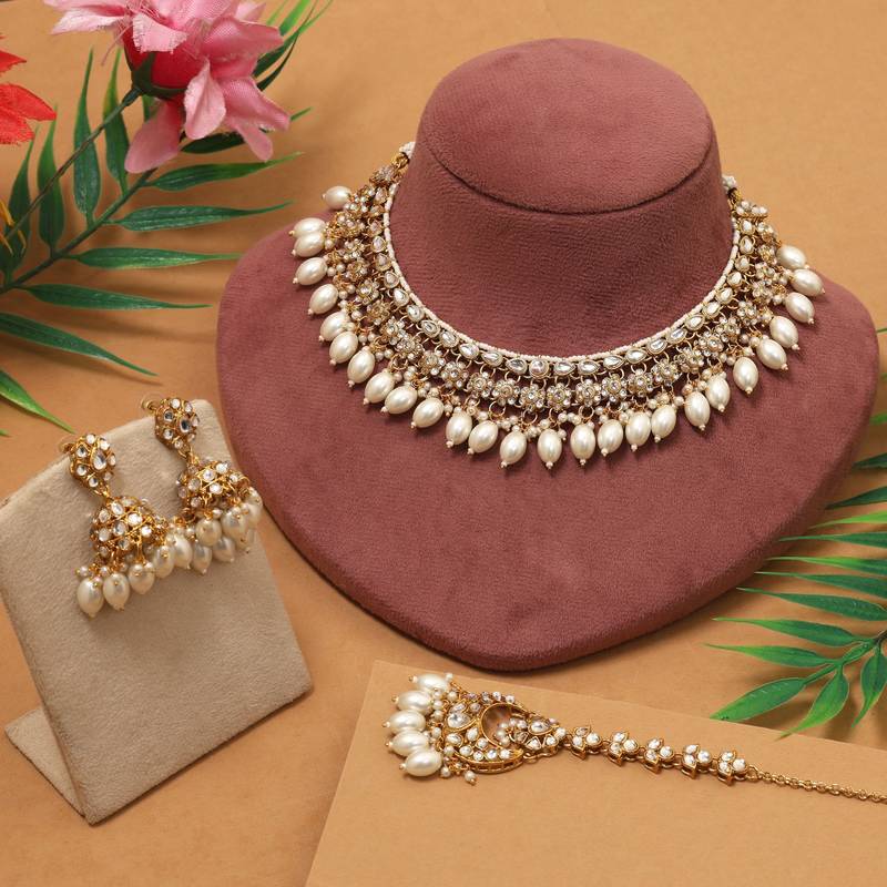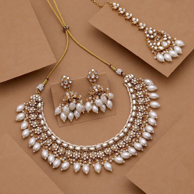 Product Description | Adjustable Rope | Necklace Length: 24.00 Cm X Width: 3.50 Cm | Earring Length: 5.50 Cm X Width: 2.50 Cm | Maang Tikka Length: 20.50 Cm X Width: 3.00 Cm | Metal: Alloy With Good Quality Gold Plated | Color: White | Stone: Kundan & Imitation Pearl | Gross Weight: 143.00 Grams | Package Content: 1 Piece Of Necklace/1 Pair Of Earring/1 Piece Of Maang Tikka | Back Finding: Post With Friction Back X Earring Style: Jhumka |
