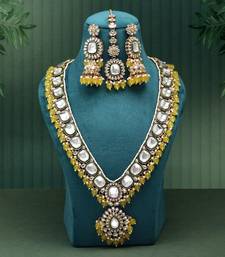 Product Description | Adjustable Rope | Necklace Length: 58.00 Cm X Width: 3.00 Cm | Pendant Length: 5.00 Cm X Width: 3.00 Cm | Earring Length: 8.20 Cm X Width: 2.50 Cm | Metal: Alloy With Good Quality Gold Plated | Color: Yellow | Stone: Kundan & Imitation Pearl | Gross Weight: 265.00 Grams | Package Content: 1 Piece Of Necklace/1 Pair Of Earring/1 Piece Of Maang Tikka | Back Finding: Post With Friction Back X Earring Style: Jhumka |