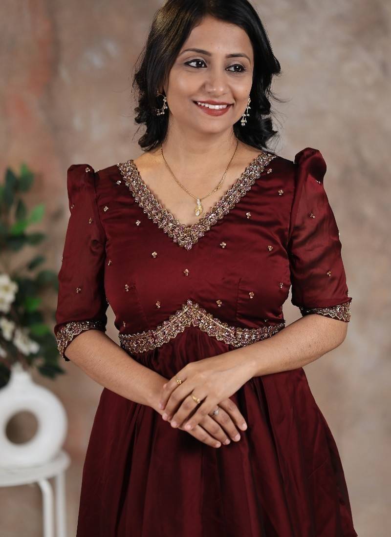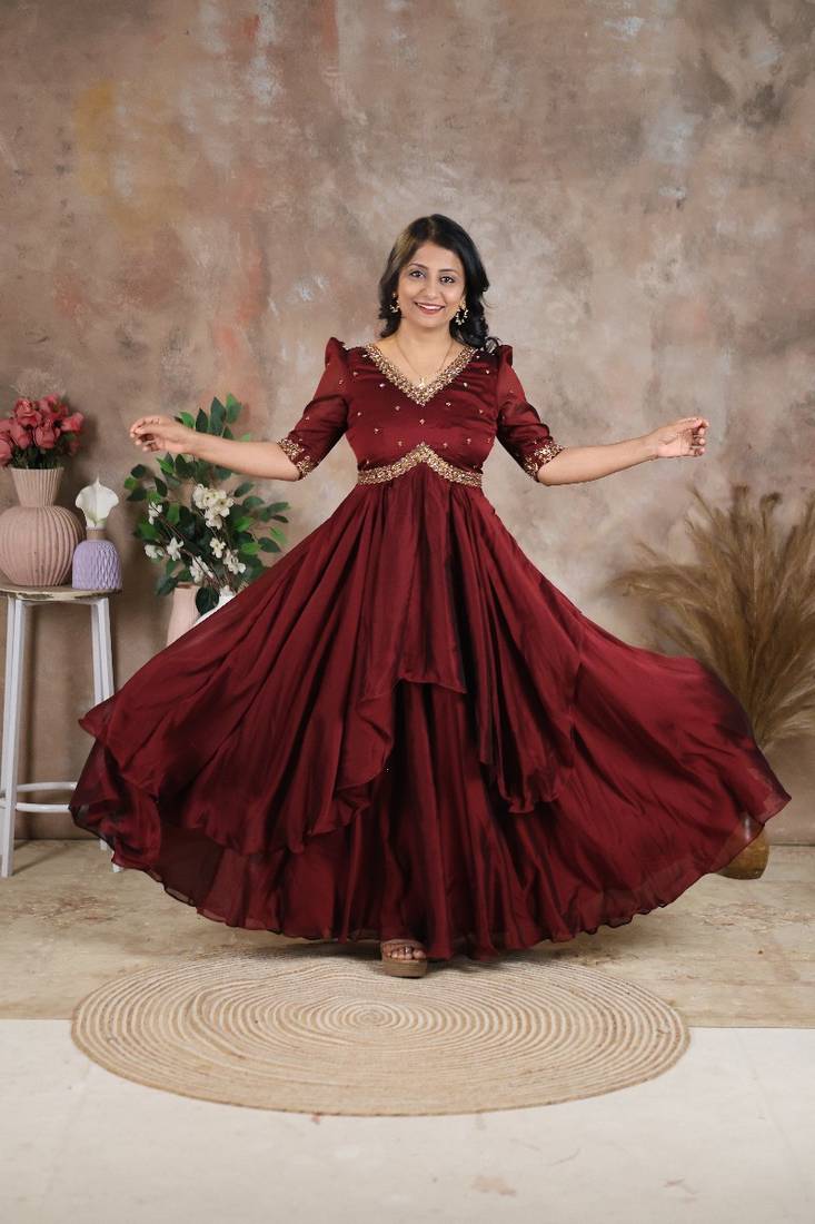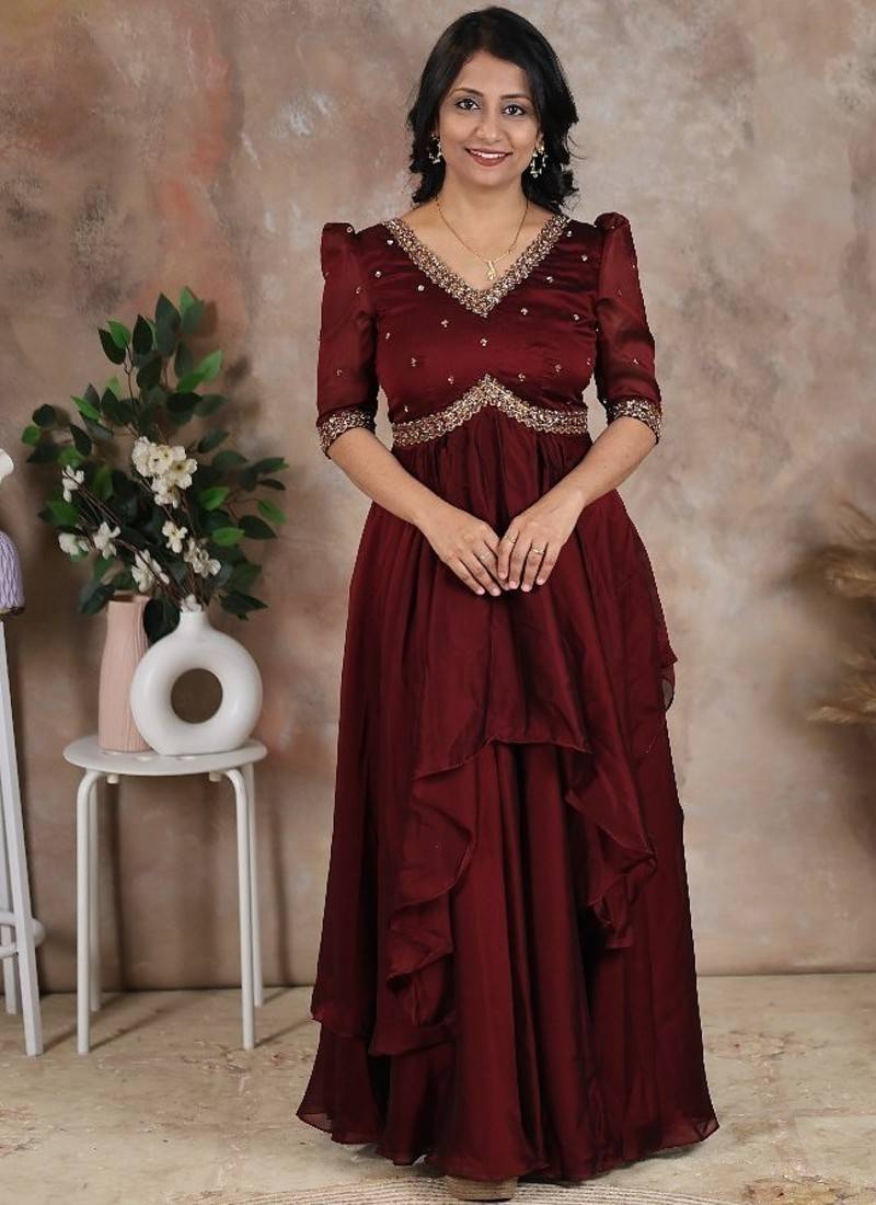 | Product Description | Crafted In A Rich Flowy Fabric With A Soft, Graceful Fall Features A Hand Embroidered V Neckline Accented With Delicate Embellishment Designed With A Defined Embroidered Waistline That Enhances The Silhouette Elegant Layered Flared Skirt Offering Fluid Movement And Comfort Finished In A Deep Wine/Maroon Shade, Ideal For Statement Ethnic Styling |