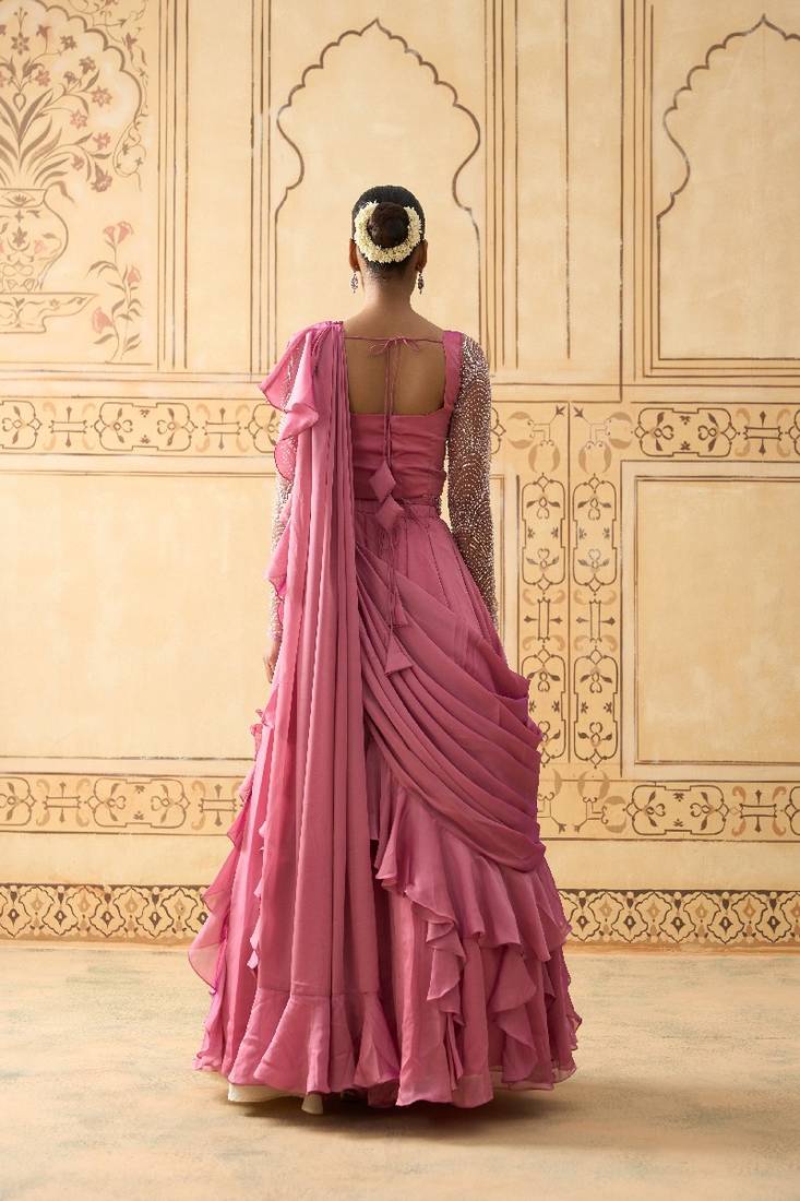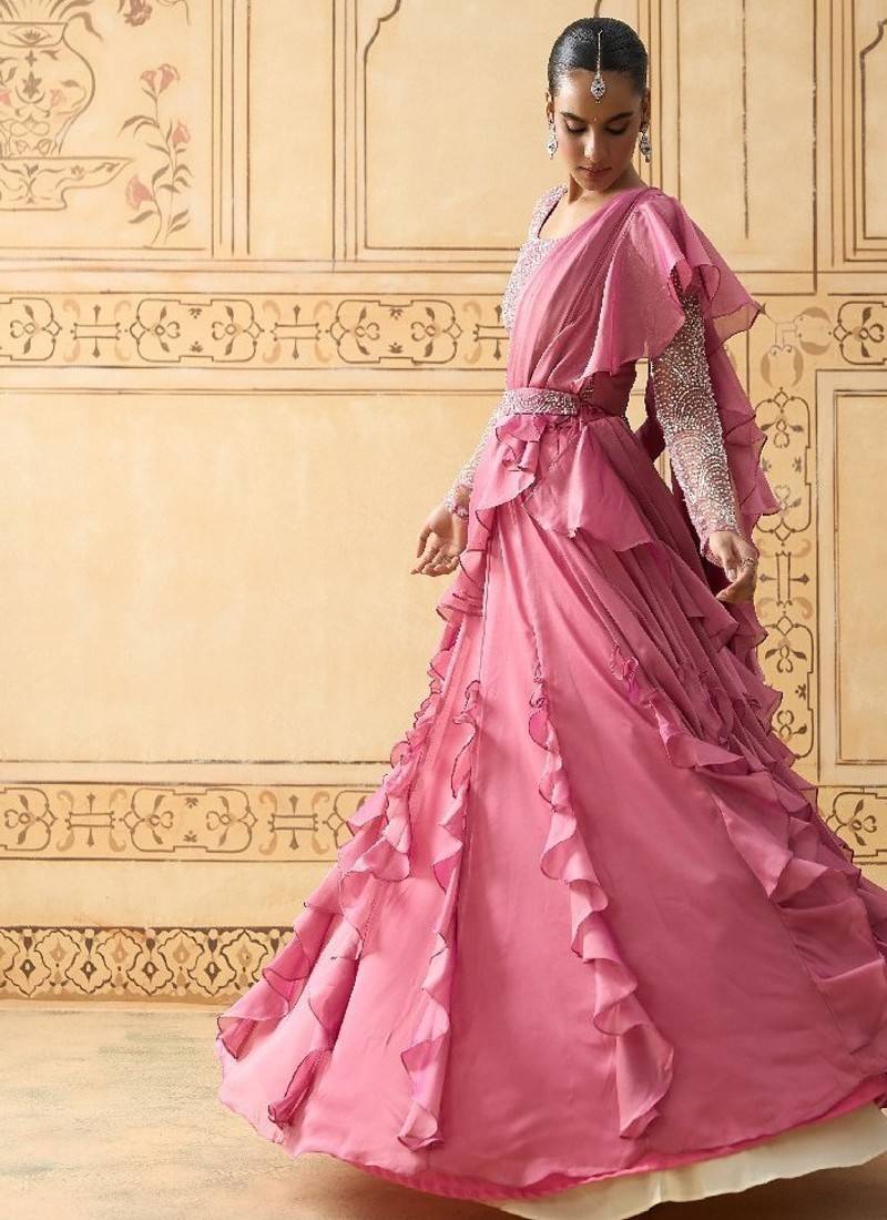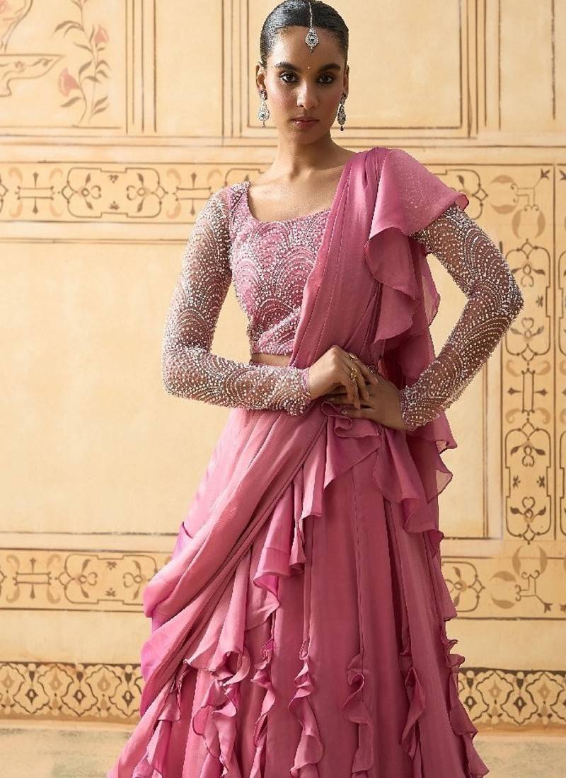 | Product Name | Onion Pink Draped Ruffle Lehenga With Pearl Work Blouse | |