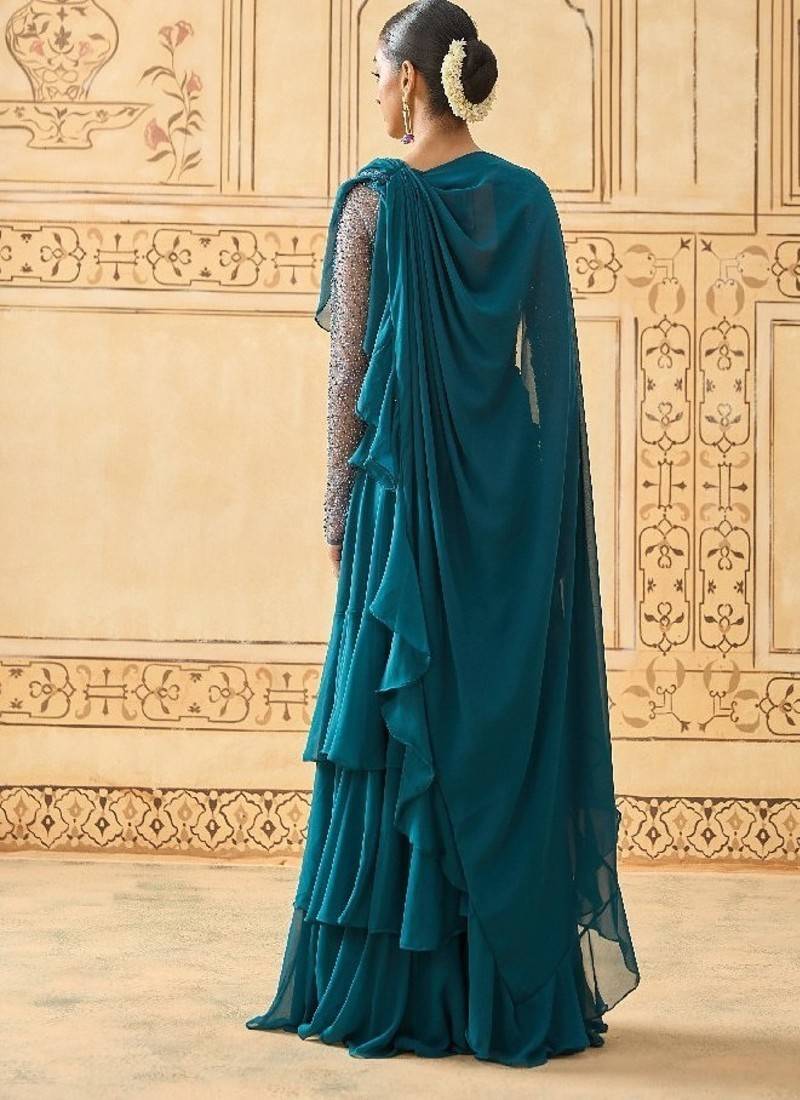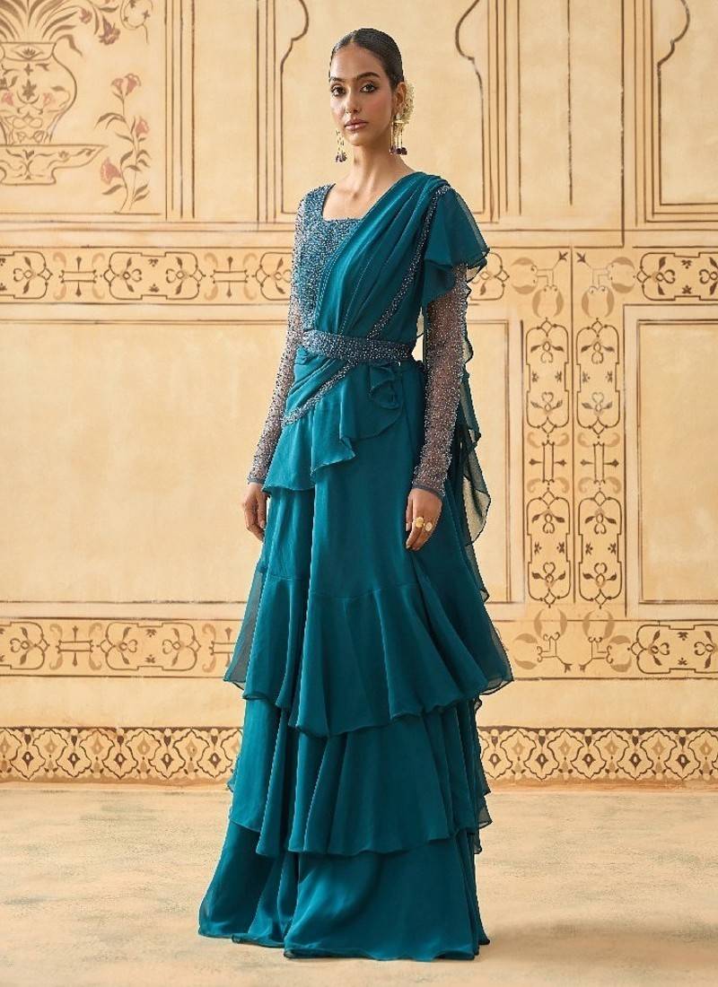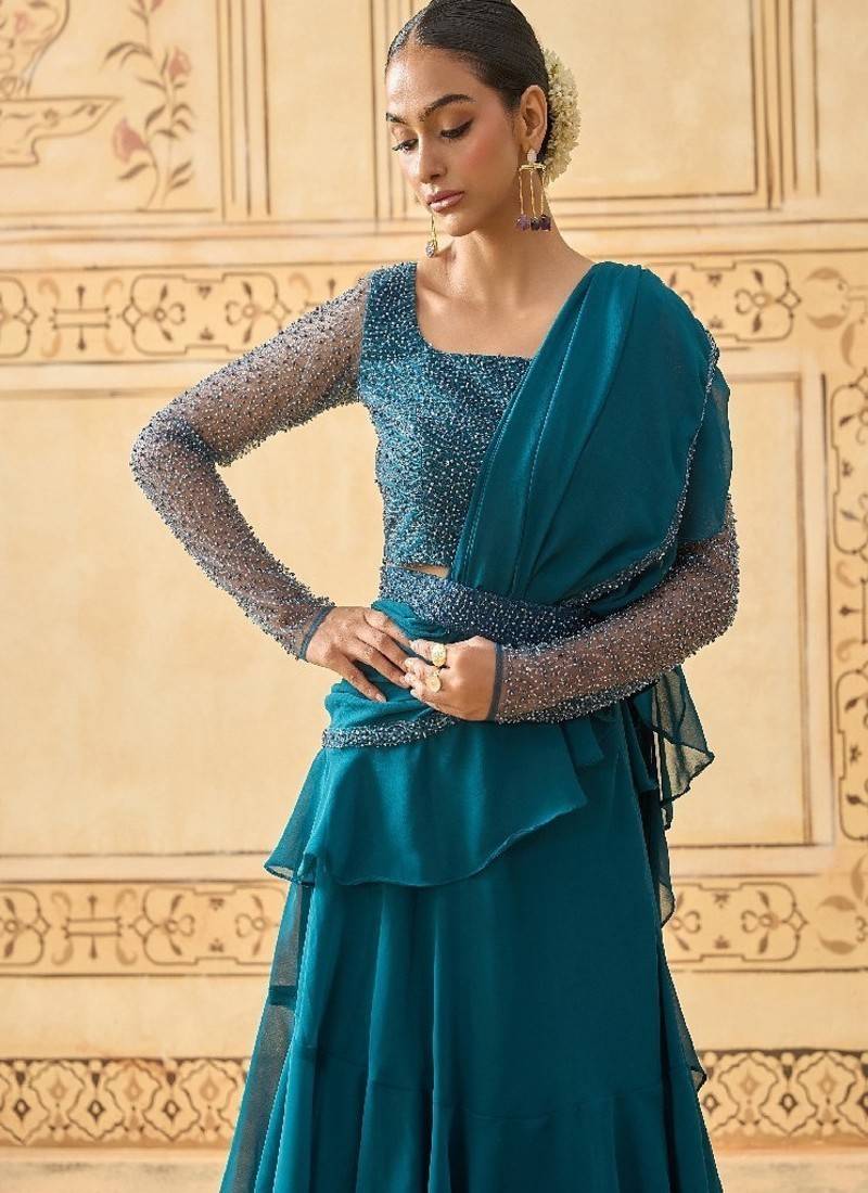 | Product Description | Midnight Teal Drape Lehenga Crafted In Flowy Georgette Three Layered Tiered Lehenga With Pre Stitched Drape For A Modern Saree Inspired Look Bead Embroidered Net Blouse With Sheer Full Sleeves And Hand Detailing Cinched Silhouette With Elegant Drape Across Shoulder And Waist Fully Lined With Buttercrepe Lining And Secured With Side Zip Closure Ideal For Cocktail Parties, Sangeet, Weddings, And Evening Celebrations |