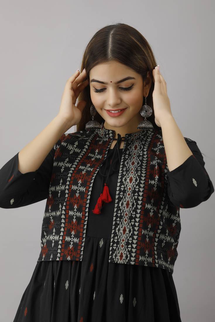 Ftdiva women ikkat anarkali kurta with jacket in black