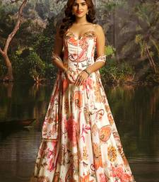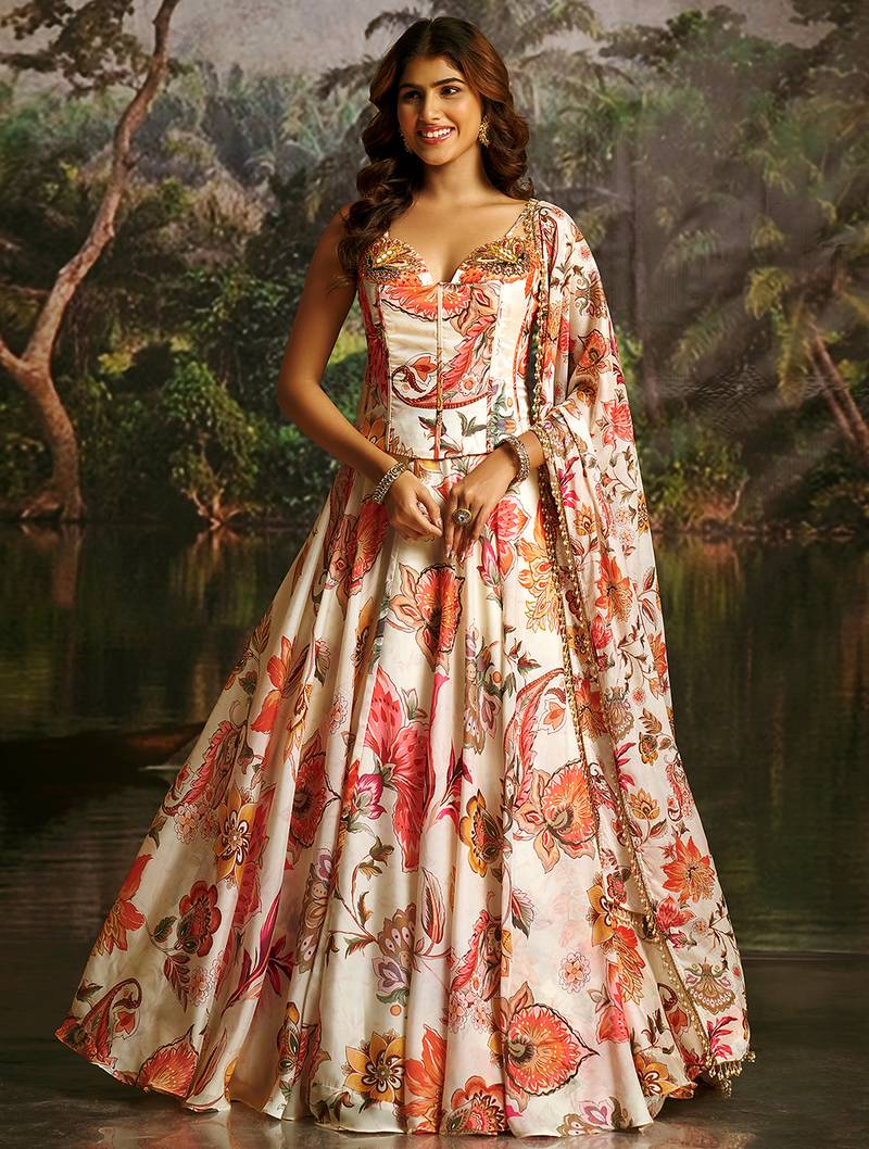 This Stunning Lehenga Set Makes An Unforgettable Entrance In Cream Silk Fabric Adorned With Bold Multicolor Floral Prints In Shades Of Coral, Orange, And Pink. The Figure Flattering Corset Blouse Features Delicate Beadwork, Sequin Embellishments Along The Neckline, And Elegant Spaghetti Straps With A Tassel Tie Up Dori Closure For A Chic, Contemporary Silhouette. The Flowy Umbrella Cut Lehenga Skirt Offers Graceful Movement, While The Matching Printed Dupatta Completes The Look With Effortless Charm. Crafted For Women Who Love Indo Western Fusion Fashion, This Ensemble Is Perfect For Weddings, Mehndi Ceremonies, Eid Celebrations, Sangeet Nights, And Festive Parties. Designed To Suit Us And International Sizing, It Ships Worldwide. Elevate Your Ethnic Wardrobe With This Show Stopping Piece Explore Our Full Collection Today.