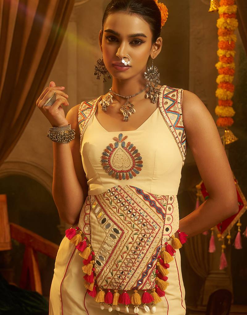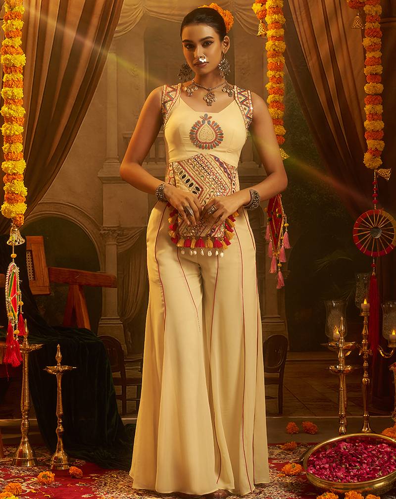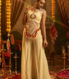 Product Description | Cream Georgette Palazzo Set Featuring Thread, Mirror, And Artificial Shell Embroidery With Tassel Accents. Perfect For Weddings, Parties, And Festive Occasions. |