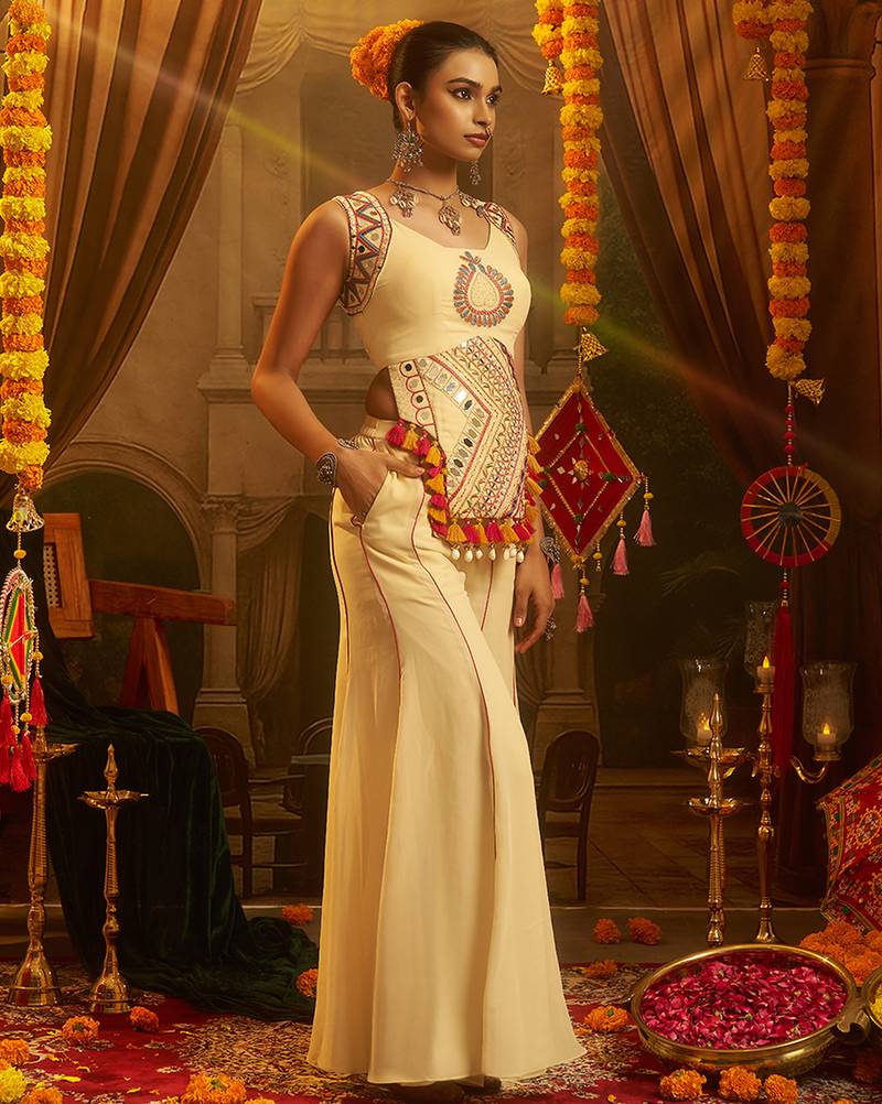 Cream georgette embroidered top with mirror, thread, tassels, shells and palazzo set