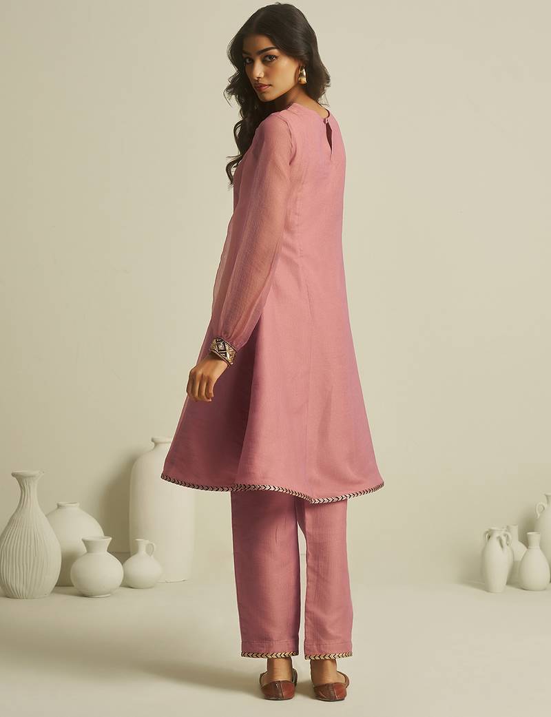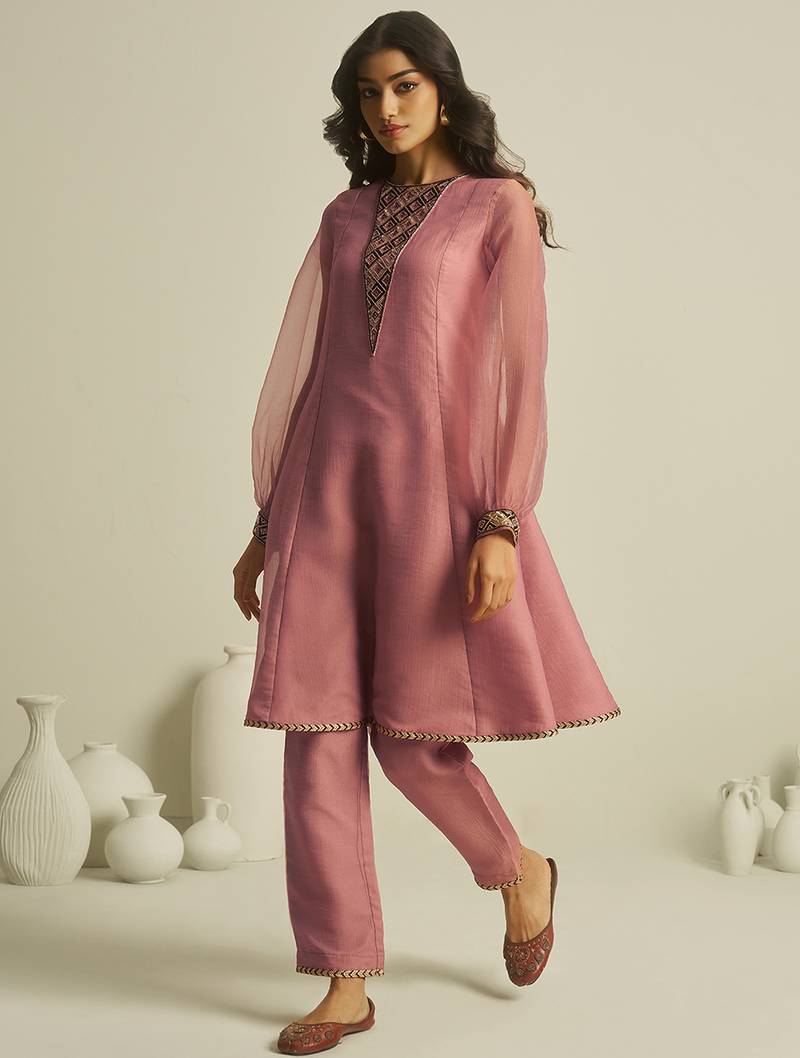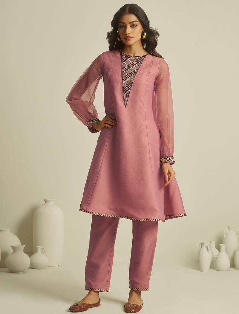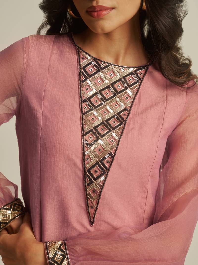 | Product Name | Peach Tissue Geometric Hand Work Kurta Set | |