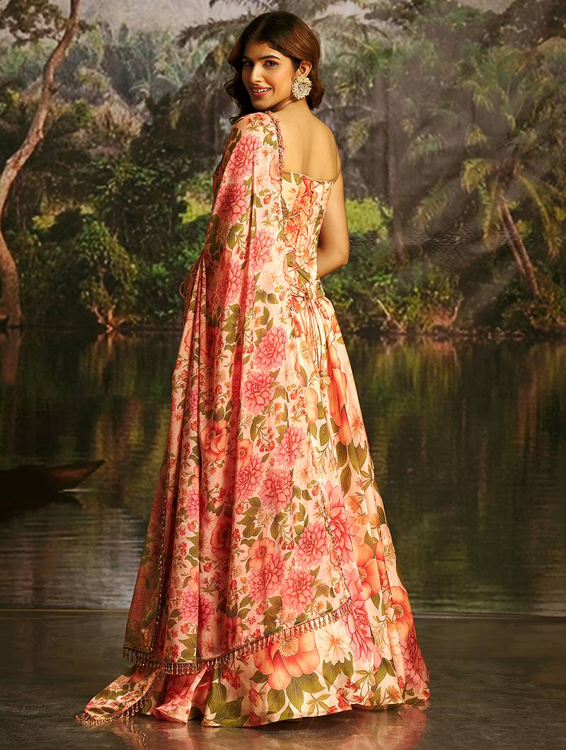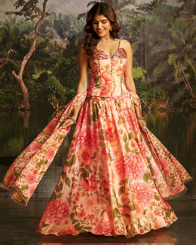 Pink Floral Umbrella Lehenga Set Crafted From Organza Fabric That Gives The Outfit A Light And Graceful Appearance. The Lehenga Features Beautiful Floral Prints That Add A Fresh And Stylish Touch To The Design. The Corset Style Blouse Enhances The Overall Look And Provides A Modern Yet Elegant Feel.