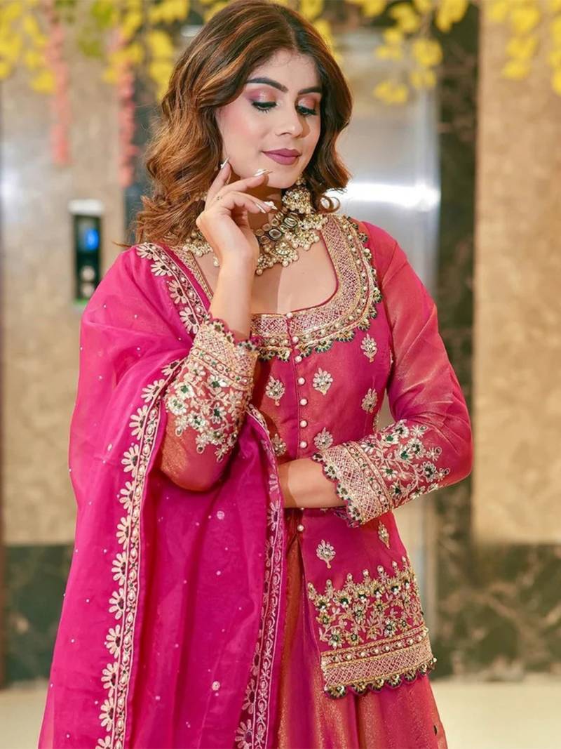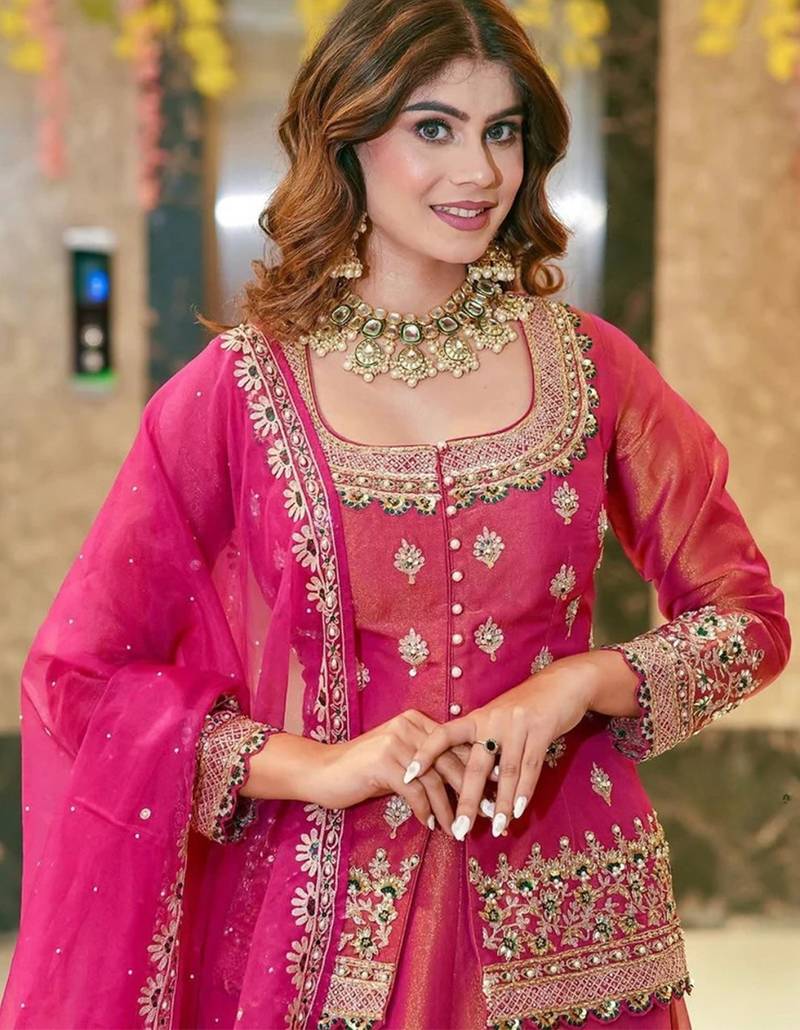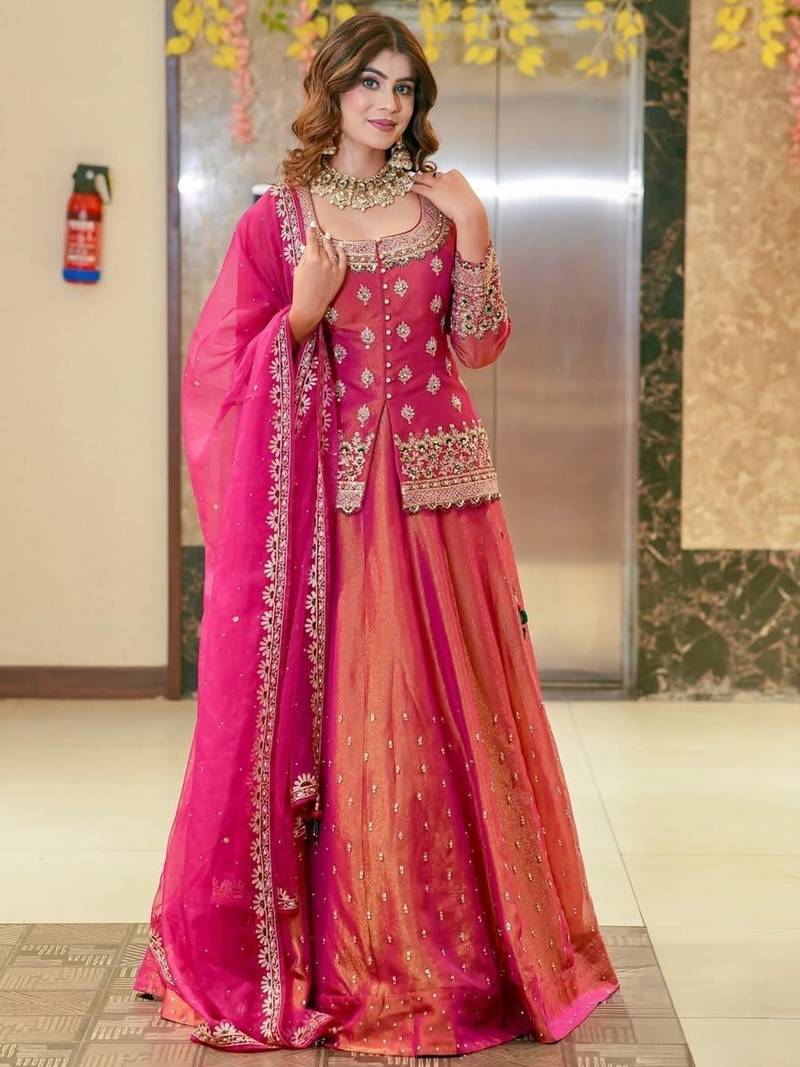 | Product Name | Pink Organza Lehenga Set With Heavy Embroidered Jacket Blouse And Zari Work Dupatta | |