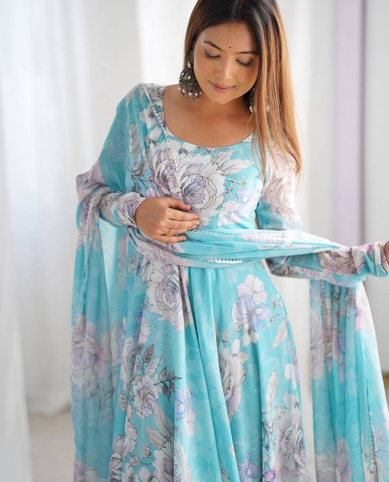 | Product Description | Graceful Floral Printed Anarkali Gown Crafted In Heavy Fox Georgette With Rich Flare, Micro Cotton Inner, And A Soft Printed Dupatta Finished With Fancy Lace For An Elegant Festive Look. |