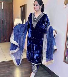 | Product Description | This Royal Blue Velvet Suit Showcases Premium Craftsmanship With Thread Work, Sequins, Rivet Motifs And Golden Lace Highlights. The Rich Winter Perfect Shade Makes It A Standout Choice For Special Occasions. |