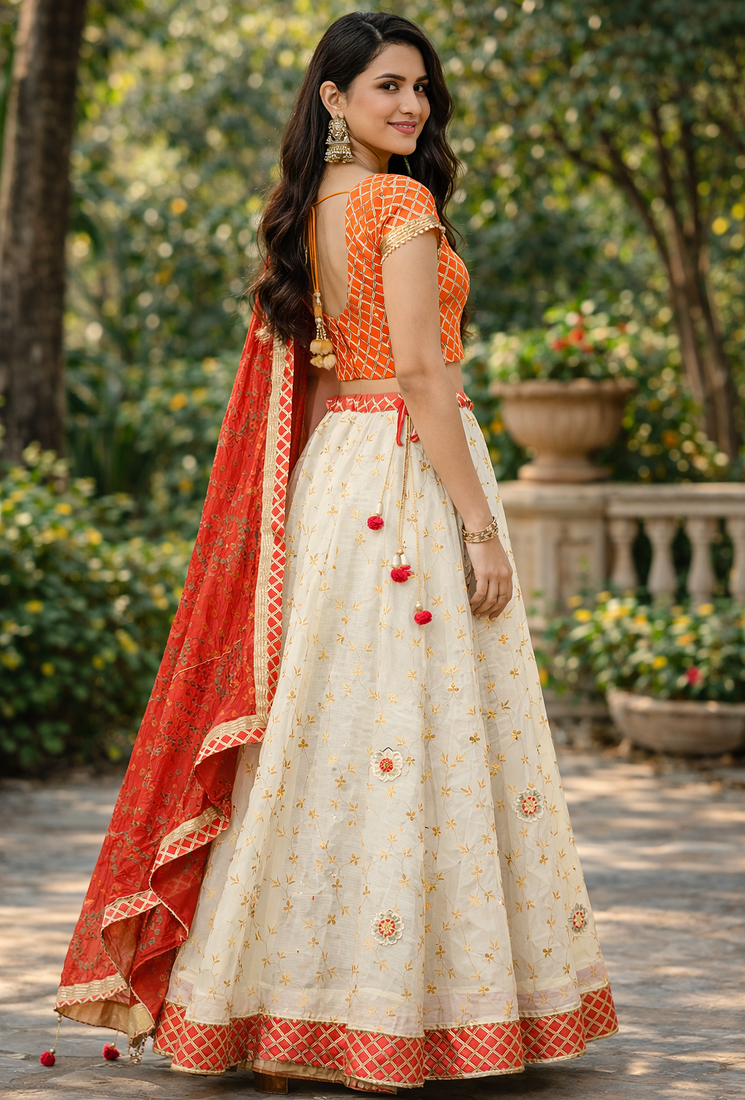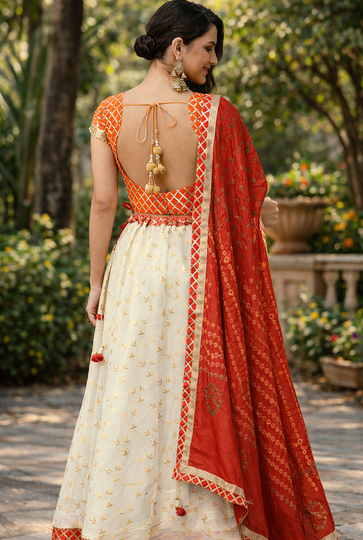 | Product Description | An Elegant White Hand Embroidered Kota Silk Lehenga Paired With A Vibrant Red Bandhani Dupatta For A Graceful, Festive Look. |