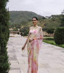 Geroo jaipur white pink shaded hand painted floral chiffon saree with blouse